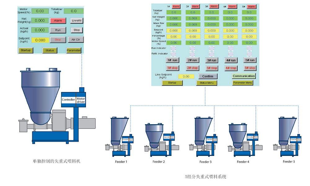 在线的卡尔麦系统CSCM控制器将电动机驱动及喂料机控制功能合二为一。CSHMI人机界面为配方的储存和记忆提供了极大的操作灵活性。控制和显示的操作界面上可同时运行多达16台喂料机。