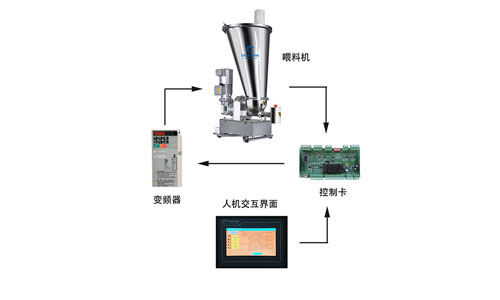 CSCM控制器采用MODBUS RTU通讯协议、RS485接口方式,控制器提供了2个通讯端口。一台触摸屏可控制多台控制器,构成简单的主从式结构。实时重量信号经由称重传感器传输到CSMC控制器,控制器负责将称重传感器传递的模拟量重量数据转换为高精度数字量信号,通过控制器内部算法,控制器得到实时流量数据,反馈给输出给变频器的转速信号(4-20mA模拟量信号)进行调整,使实际流量不断趋近于设定流量,从而达到控制目的。